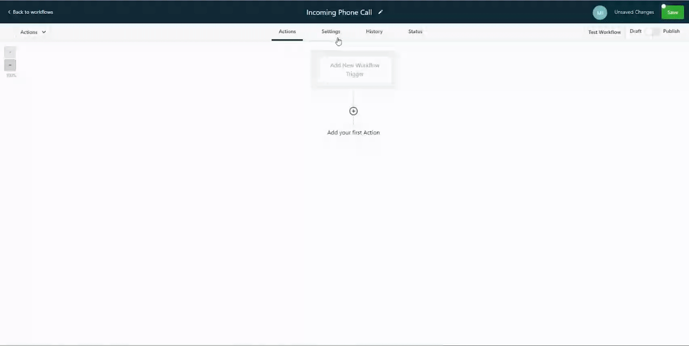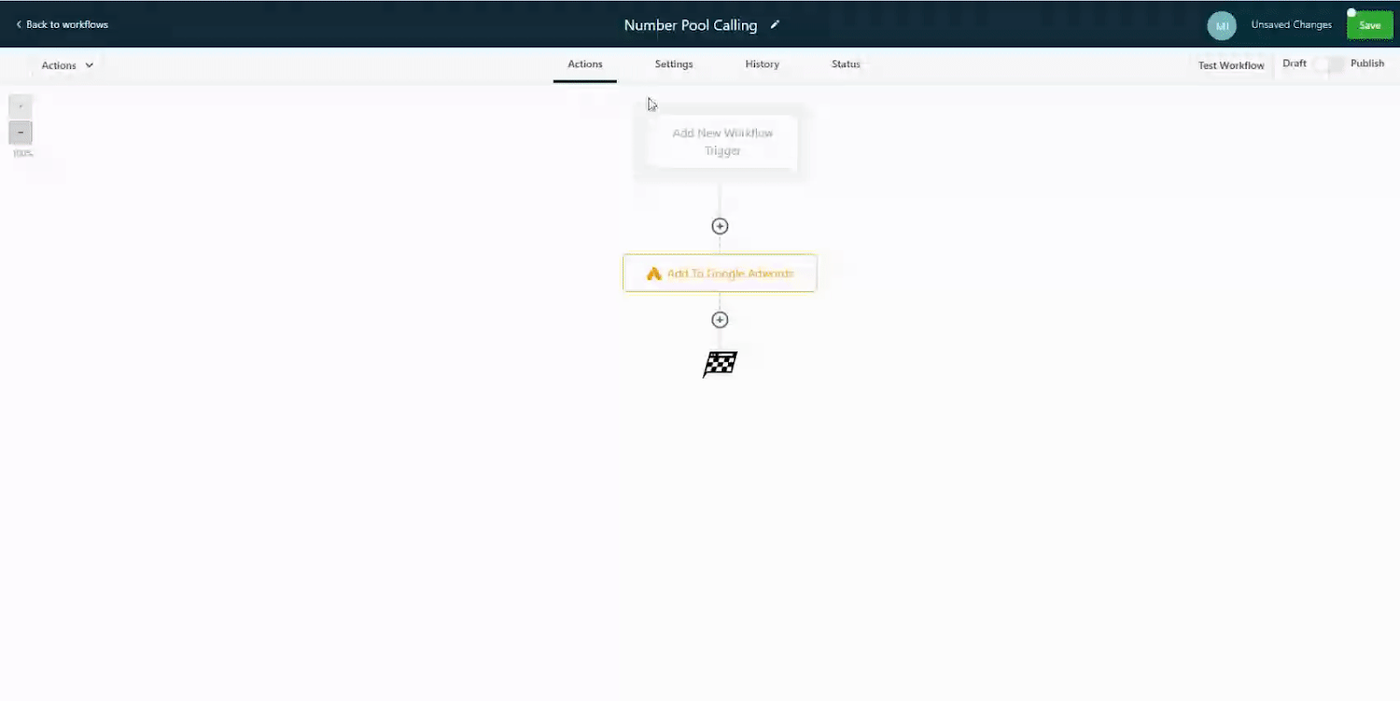 Workflow can be created for Form Submission, Order Purchases, Incoming Phone Call, Number Pool Calling, Survey Submission, and Chat Widget.