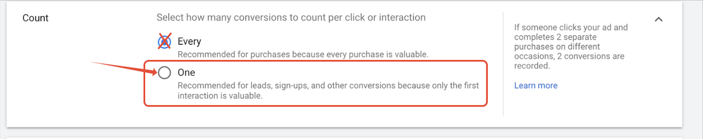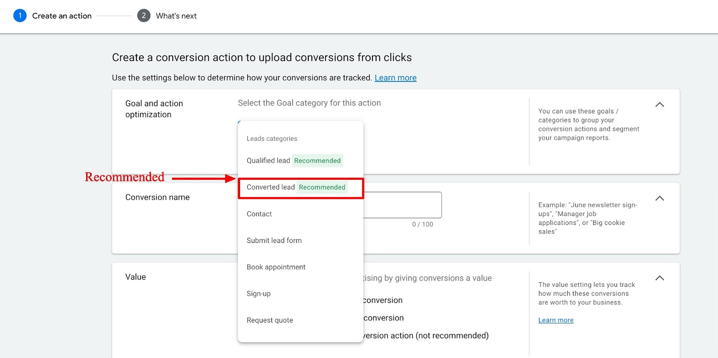 For the Goal and action optimization section below select "Converted Lead" as the Primary option.