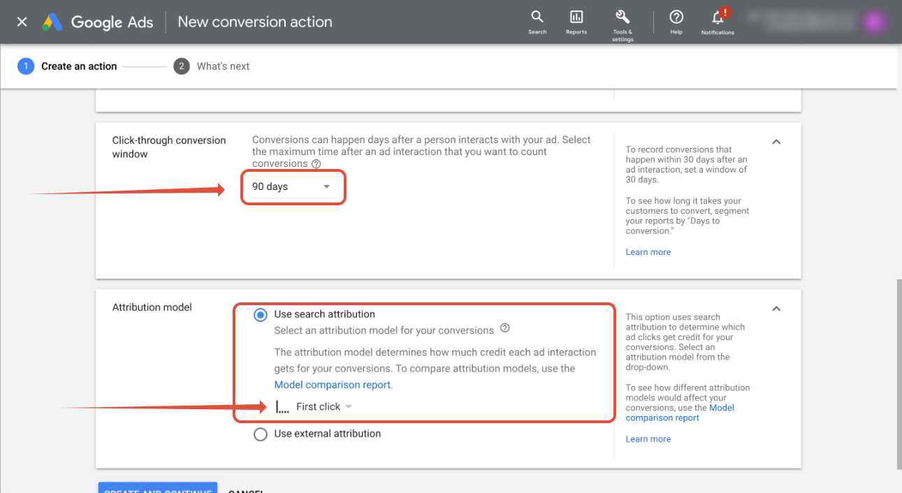 2. Next, set the Attribution model as "First click" or "Latest click" (recommended)... more info